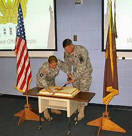 On July 9, 2009, the Adjutant General's School commemorated the Army Warrant Officer Corps' 91st Birthday at the Soldier Support Institute, Fort Jackson, SC.  Chief Warrant Officer 5 Jeanne Pace (left) and Warrant Officer 1 Nandi Branford had the honor of cutting the cake.  Colonel Robert Manning, Commandant, Adjutant General's School and Chief Warrant Officer 5 Scott Hagar provided opening remarks and toasted the momentous occasion.  The birthday commemoration was attended by over fifty active duty and retired Adjutant General warrant officers and other personnel from throughout the Soldier Support Institute.