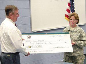 In September 2009, on behalf of the Above the Best chapter of the U.S. Army Warrant Officers Association, chapter president Chief Warrant Officer 5 Julia Mosman, right, presented retired Colonel Bob Bunting with a donation to help defray the cost of the upcoming World War II Veterans Honor Flight to Washington, D.C. The September 26 flight will transport about 100 veterans and their guardians to the nation’s capital to see the monument built in their honor. Veterans travel free because of the financial support of area cities and organizations.