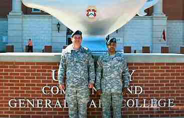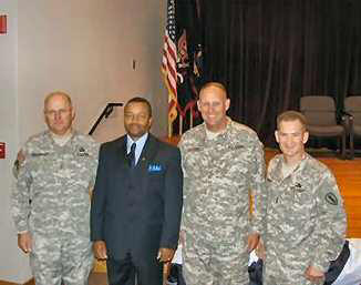 July 15, 2009 – History is changing fast for tomorrow’s Army warrant officers.  For the first time, U.S. Army warrant officers have been assigned as instructors for the Intermediate Level Education course at the U.S. Army Command and General Staff College.  Chief Warrant Officers 4 Darren Lester, Ronnie Patrick, Brian Edwards and Anthony Williams are currently assigned to the College's Department of Logistics and Resource Operations. They will present and facilitate graduate-level course material in multi-functional logistics at the tactical, operational and strategic levels of war for active duty, army reserve, national guard, sister-service, international and interagency students.  Pictured left are CW4 Anthony Williams and Darren Lester (Ordnance) and pictured right CW4 Brain Edwards and Ronnie Patrick (Quartermaster).