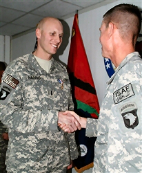 On November 28, 2008, Chief Warrant Officer 2 Jonathan Harris, a Blackhawk pilot who withstood enemy fire to save a wounded crewmember in Afghanistan, was awarded a Silver Star. Not to be outdone, his 60-year-old father retired Staff Sgt. Gary Harris was awarded a Silver Star and a Bronze Star in a simultaneous ceremony honoring his bravery in Vietnam. The two generations watched each other through a video teleconference between Fort Campbell, KY where the elder Harris was honored, and Bagram Air Base in Afghanistan, where Jonathan is completing a tour. Maj. Gen. Jeffrey Schloesser, Commander of U.S. forces in Afghanistan, told the elder Harris via video that he hoped the special ceremonies repaid the Army’s failure to give him an official ceremony nearly 40 years ago. He was officially pinned with a Silver Star and Bronze Star by the Brig. Gen. Steve Towsend, Deputy Commanding General-rear, 101st Airborne Division, for gallantry in action against an armed hostile force in Vietnam. Pictured left Maj. Gen. Schloesser shakes the hand of CW2 Harris. Pictured right Brig. Gen. Townsend, Pins the Silver Star on SSG (Ret) Harris. (Courtesy Associated Press and the American Forces News Service)