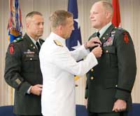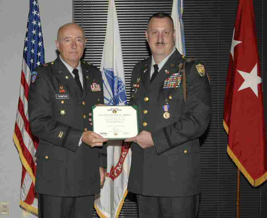 On 30 July 2009, Defense Information Systems Agency Director Lt. Gen. Carroll F. Pollett presented the Army’s Soldiers Medal to Army Reserve Chief Warrant Officer 3 (Promotable) Walter B. Harris at Scott Air Force Base in Illinois. Harris on December 2, 2006 was in a life-or-death race to save the lives of two people at the risk of his own life.  He was awarded the prestigious Soldier’s Medal - the Army’s highest award for heroism not involving combat - for risking his life to safely drag his unconscious father-in-law out of a poisonous house that had eight times the lethal limit carbon-monoxide in Harris’ hometown of Glen Carbon, Ill., and for attempting to save his mother-in-law from the deadly effects of the poisonous gas. Harris is a civilian Technical Support and System Administrator Chief with the Procurement Directorate at the Defense Information Technology Contracting Organization at Scott Air Force Base, Ill. He commands a detachment of U.S. Army Reserve Element-DISA at the base. Pictured left: Lt. Gen. Pollett pins the medal on CW3 Harris. Pictured right: CW5 James Thompson, Command Chief Warrant Officer of the Army Reserve and CW3 Harris.