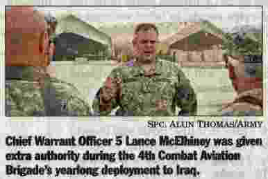 Also in June 2009, The 4th Combat Aviation Brigade came home from a year in Iraq with every one of its 113 helicopters and 2,800 soldiers. The brigade logged 92,000 flight hours, transported 3,500 patients, did 22,000 troop movements and ferried countless numbers of people to locations in and around Baghdad with no accidents, no injuries and no fatalities, Colonel Pat Tierney, the commander said. He credited the safety record not only to luck and hard work, but also to giving the chief warrant officers an elevated status on par with battalion and brigade commanders and command sergeants major, and giving them a “somewhat unorthodox” title. “We called them ‘command chief warrant officers,’ ” Tierney said. The brigade was “really fortunate” to deploy with several senior warrant officers, he said. Their expertise, and their command status, may have helped save lives, he said. He made the unusual move of placing chief warrant officers 5 in each of his five battalions and kept one in particular at the top of the brigade with him and his command sergeant major. That one was Chief Warrant Officer 5 Lance McElhiney, a 62-year-old with 41 years flying Army helicopters. See complete article - courtesy ArmyTimes.com.