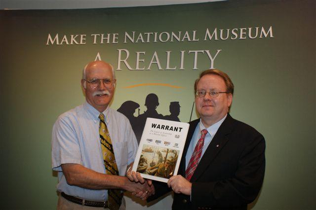 On November 3, 2009, Warrant Officers Heritage Foundation (WOHF) Chairman of the Board CW5 (Ret) Richard Markle visited the Army Historical Foundation (AHF). During the visit the WOHF proposal was presented for approval to place six granite benches funded by the Warrant Officers Heritage Foundation in the Memorial Garden of the National Museum of the U. S. Army (NMUSA) engraved in memory of our Fallen Warrant Officer Comrades. The  theme is "SOME GAVE ALL - ALL GAVE SOME" with each bench engraved to cover a period of conflict, i.e. 'THE WORLD WARS", “KOREA”, “VIETNAM”, “PANAMA - SOMALIA – HAITI”, “PERSIAN GULF” and “GLOBAL WAR ON TERROR”.  The design and proposal to fund and install the benched is pending approval by the Army.  Also during the visit, Markle presented a $5,000 Grant to the National Museum Capital Fund Raiser on behalf of the Warrant Officers Heritage Foundation and the U. S. Army Warrant Officers Association (USAWOA). Also presented were two copies of WARRANT The Legacy of Leadership as a Warrant Officer history book, one for the NMUSA Research Library and the other as a desk reference for the AHF Historian. Also, on November 6th USAWOA National President CW5 Gary Nisker announced the Memorial Bench design and the $5,000 donation to the NMUSA Fund Raiser to the attendees at the USAWOA 37th AMM in Salt Lake City.   CW5 Nisker also announced a campaign to raise $100,000 toward construction of a proposed Warrant Officer Historical Exhibit commemorating the 100th Birthday of the Army Warrant Officer Corps in July 2018 - see more. Pictured at the top center is a sample of a Memorial Bench. Pictured above left, CW5 (Ret) Markle presenting the $5K grant check to Maj. Gen. (Ret) John P. Herrling, Campaign Executive Director, of The Army Historical Foundation.  The grant is to be used toward the construction of the National Museum of the United States Army (NMUSA). Pictured above right, CW5 (Ret) Markle presenting a leather bound copy of "WARRANT The Legacy of Leadership as a Warrant Officer" to Mr. Matt Seelinger, Chief Historian of The Army Historical Foundation, and editor of "On Point: The Journal of Army History," for the reference library of the NMUSA.  The presentations took place on Tuesday, November 3, 2009 at The Army Historical Foundation headquarters in Arlington, VA.