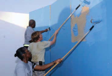 Pictured: Chief Warrant Officer 4 Spencer Douglas (far left), communications and electronics chief, 498th Support Maintenance Company, 103rd Sustainment Command (Expeditionary) (ESC), a Raleigh, N.C., native; Chief Warrant Officer 4 Starla A. Brown (middle), human resources technician with the 18th Adjutant General Company, 3rd Sustainment Brigade, 103rd ESC, and a St. Maries, Idaho native; and Chief Warrant Officer 2 Darlene A. Pittman (bottom), executive officer for G1 Plans with the 103rd ESC, and a Des Moines, Iowa, native, help beautify the USO building by painting the outside walls. (Story and photos by Sgt. Jessica Rohr, Expeditionary Times Staff)